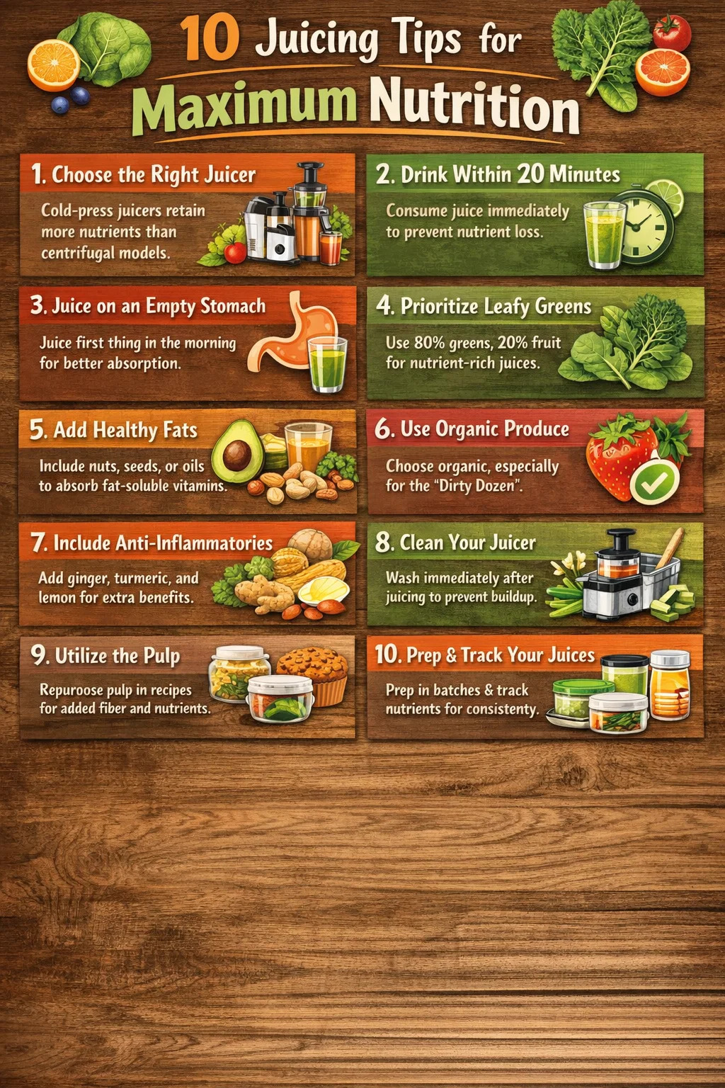 Adaptarea rețetelor de sucuri la disponibilitatea sezonieră nu este doar inteligentă din punct de vedere economic, ci este superioară din punct de vedere nutrițional. Primăvara și vara aduc verdețuri cu frunze abundente, castraveți, dovlecei, roșii, fructe de pădure și fructe cu sâmburi. Toamna și iarna oferă sfeclă, morcovi, păstârnac, citrice, rodie și legume rădăcinoase robuste. Fiecare sezon oferă propriul profil unic de fitonutrienți, iar rotația prin produse sezoniere asigură în mod natural varietatea de micronutrienți pe tot parcursul anului.