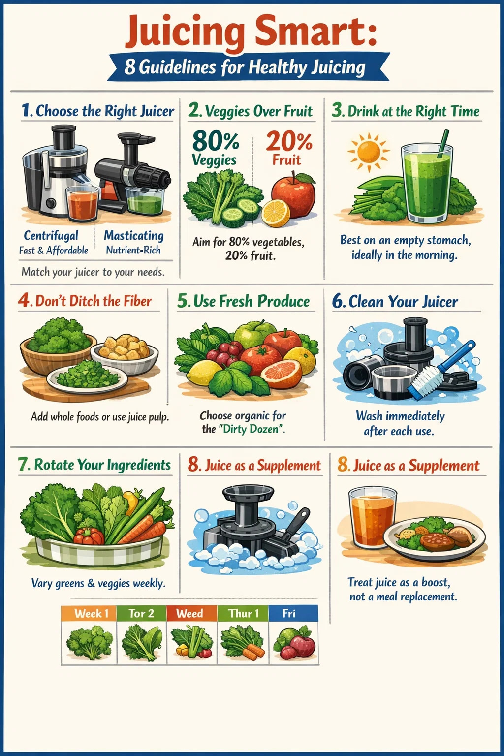 Dacă doriți un răspuns simplu: sucurile funcționează cel mai bine atunci când suplimentează o dietă echilibrată, mai degrabă decât înlocuirea alimentelor integrale. Storcatorul potrivit, ingredientele potrivite si cateva obiceiuri inteligente fac diferenta intre o rutina cu adevarat sanatoasa si una care te incarca linistit cu zahar. Cele 8 linii directoare de mai jos reduc zgomotul și vă oferă un cadru practic pe care îl puteți urma cu adevărat.