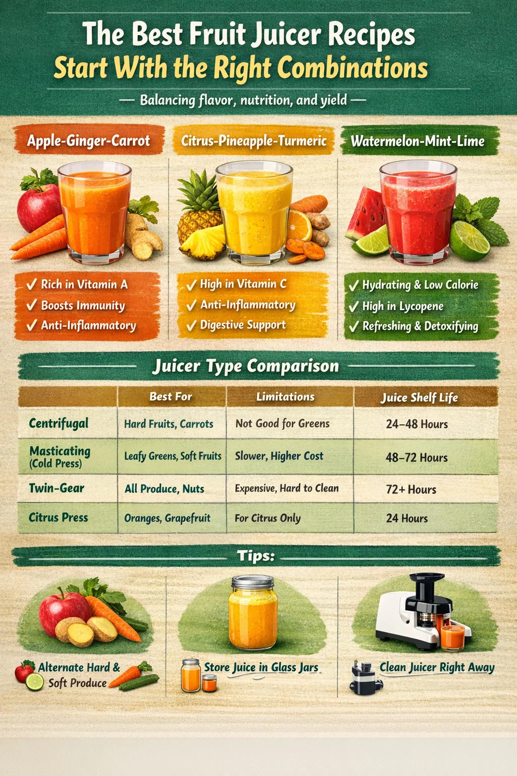 Măr-ghimbir-morcov este cel mai versatil punct de intrare pentru oricine nou în rețetele de storcator de fructe. Mărul oferă o bază dulce neutră care completează aproape orice. Morcovul adaugă corp și beta-caroten. Ghimbirul proaspăt elimină dulceața și adaugă căldură care face băutura să se simtă mai puțin ca un desert și mai mult ca ceva funcțional.