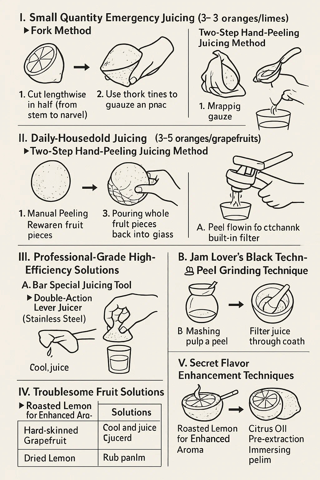| Pomelo cu pielea groasă | Cuptor cu microunde 20 sec → Loviți cu cuțitul înapoi → Stoarceți carnea cu mâna | Sparge membranele rigide → cu 40% mai mult suc |