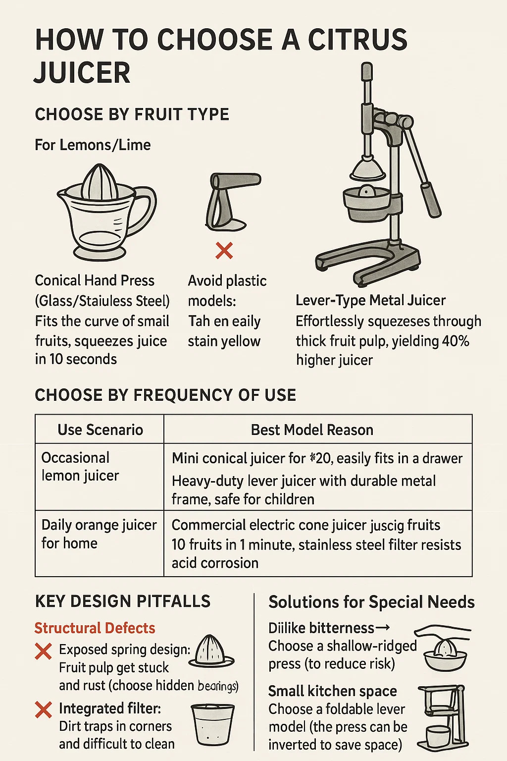 Spațiu mic de bucătărie → Alegeți un model de pârghie pliabil (presa poate fi inversată pentru a economisi spațiu). Păstrați pulpa → Folosiți un model manual fără filtru și lăsați pulpa să cadă direct în cană.
