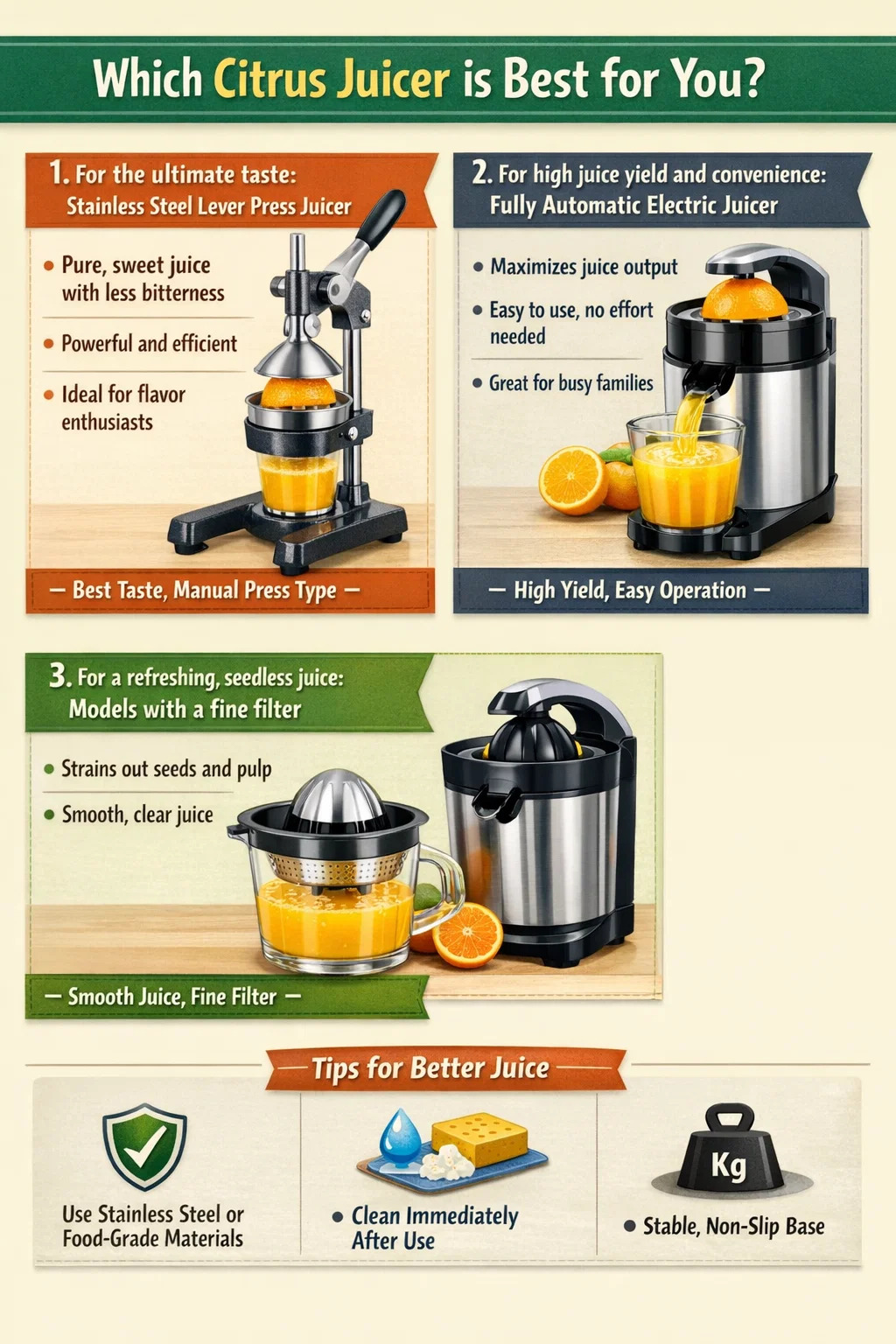 Pentru a extrage suc proaspăt și cu gust pur, alegând cel potrivit storcator de citrice este crucială. Există multe mașini pe piață, dar care dintre ele este „cel mai bun” depinde într-adevăr de cerințele dumneavoastră pentru „delicios” și „textură”.